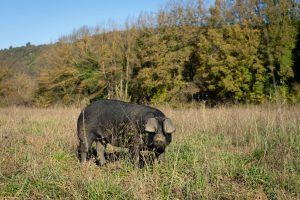 Le Porc Noir de Provence est issu d’une race ancienne locale (Porc de Bourdeaux) éteinte suite à la révolution agricole industrielle des années 60. Il s’agit d’un porc rustique, parfaitement adapté aux territoires d’intervention et au modèle d’élevage extensif.